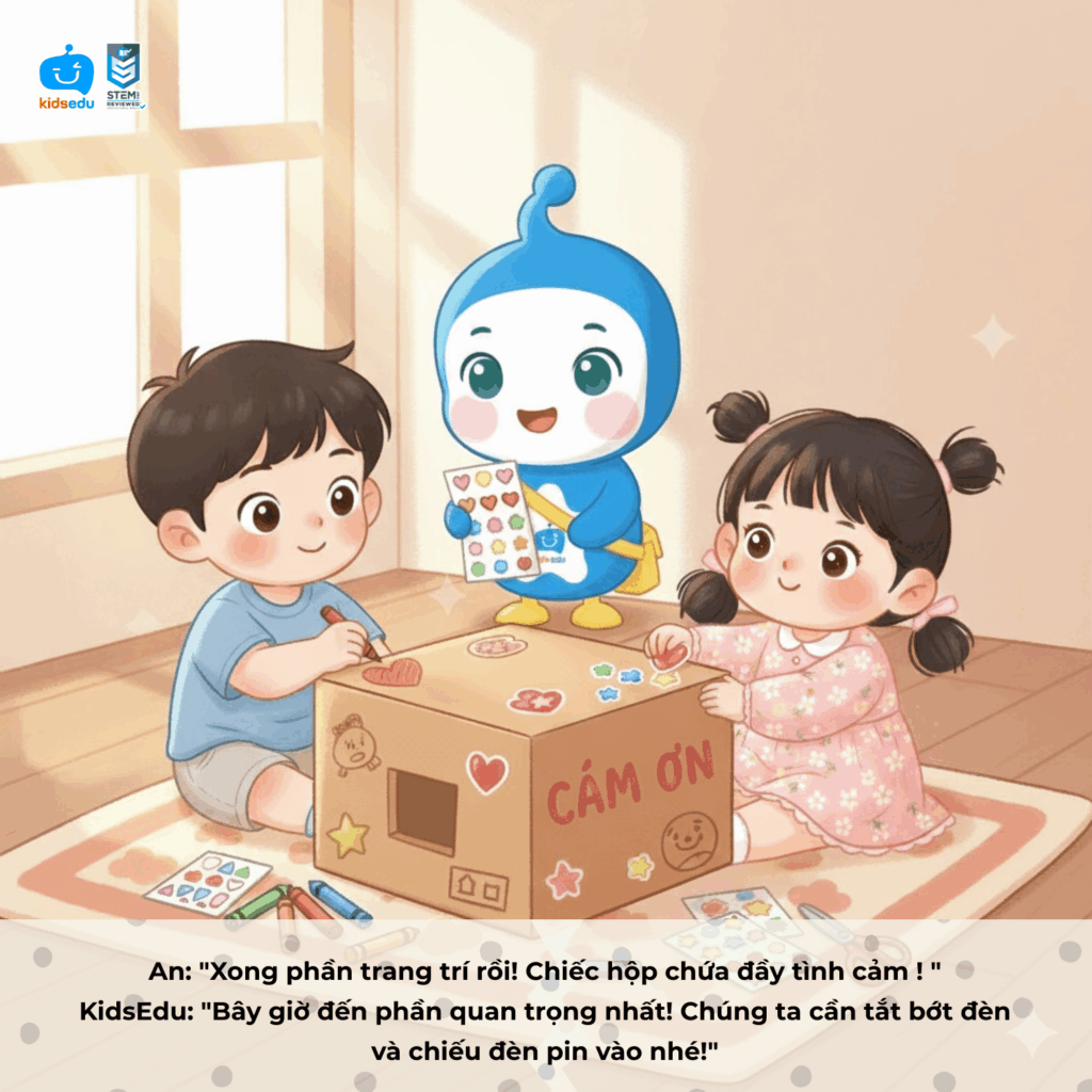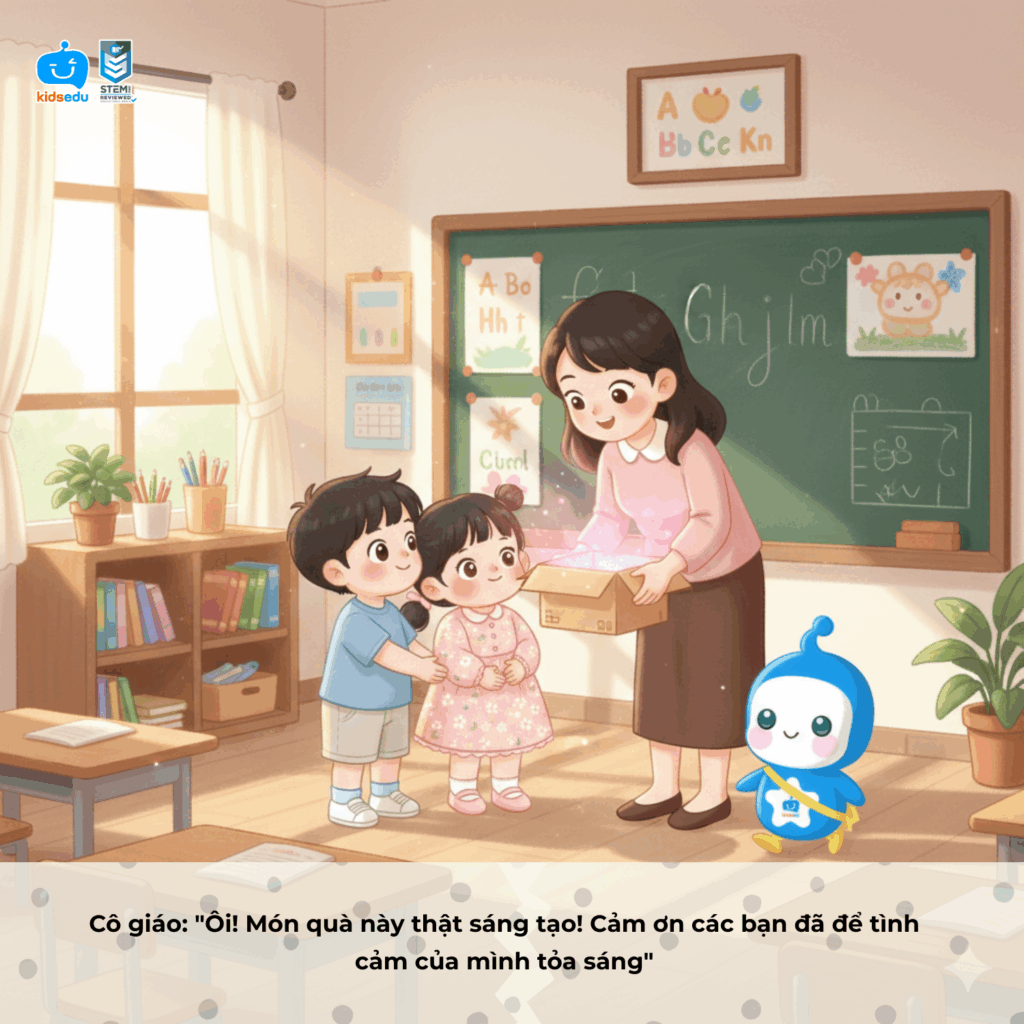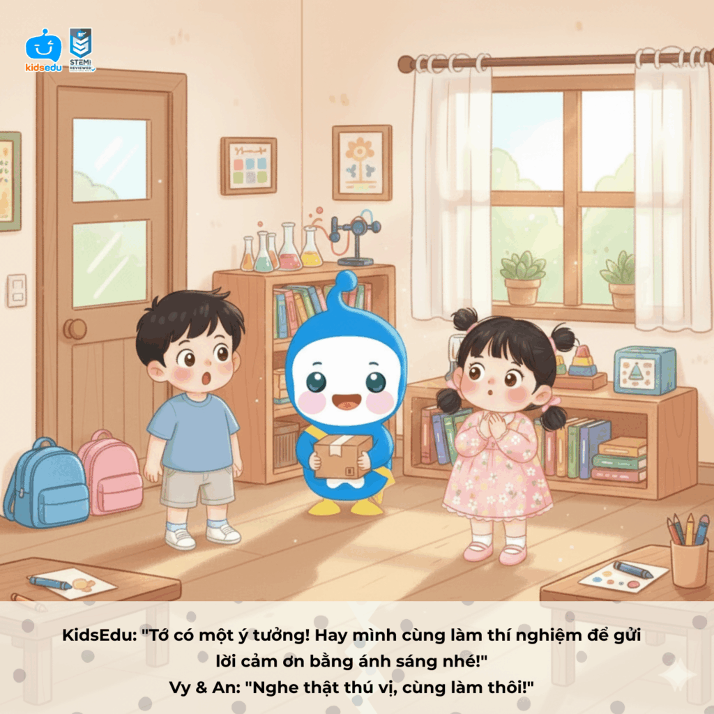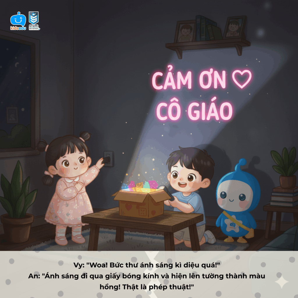 Câu chuyện bắt đầu từ An và Vy – hai bạn nhỏ muốn làm điều gì đó thật đặc biệt để gửi lời cảm ơn đến cô giáo của mình. Với gợi ý từ KidsEdu, hai bạn đã cùng nhau tạo nên một “bức thư ánh sáng” bằng hộp giấy, giấy bóng kính và đèn pin. Khi ánh sáng chiếu qua lớp giấy trong suốt, dòng chữ “Cảm ơn cô giáo” hiện lên rực rỡ trên tường, khiến cô giáo mỉm cười xúc động.