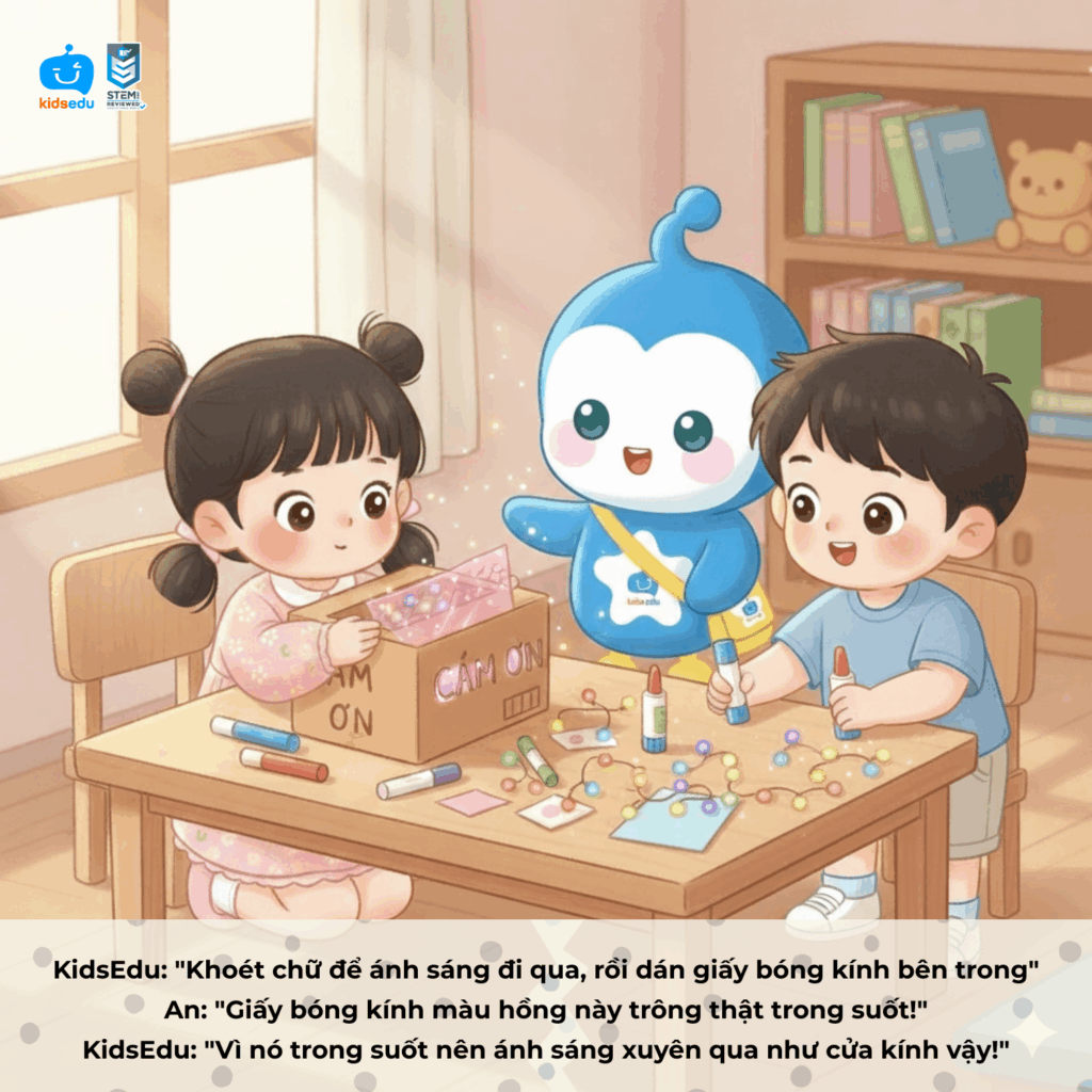 Hoạt động “Bức thư ánh sáng” giúp trẻ hiểu về hiện tượng truyền ánh sáng qua vật liệu trong suốt, đồng thời rèn luyện khả năng quan sát, tư duy sáng tạo và làm việc nhóm.